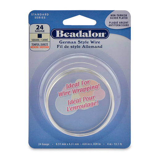 This German Style Wire has a square shape and is silver plated, perfect for adding a unique touch to your jewelry designs. The 24 gauge (.51 mm / ....