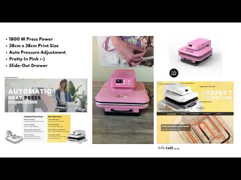 Our cute big pink press has great pressing Power up to 1800W, Temp: 100-210 Degrees. Pressing Area 35cm x 35cm (15 inchx15 inch), SA Voltage & Plug, Blanching Time - 0-99sec. This Lady is discounted because it is our store demo model and have been used only a hand full of times. Still in new condition.