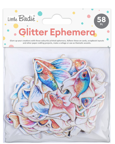Dive into creativity with Little Birdie's Glitter Ephemera Fab Fins collection. This stunning 58-piece set features shimmering, fin-shaped embellis...
