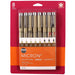 Pens with a waterproof, quick-drying pigment ink that will not feather or bleed through even the thinnest papers. Inks are smearproof once dry and fadeproof against sunlight or UV light. Colors remain vibrant and are permanent and washable on cotton fabrics. Set includes 005 .2mm, 01 .25mm, 02 .3mm, 03 .35mm, 05 .45mm and 08 .5mm Pigma Micron Pens; 1mm bullet Pigma Graphic Pen; and Pigma Brush Pen.