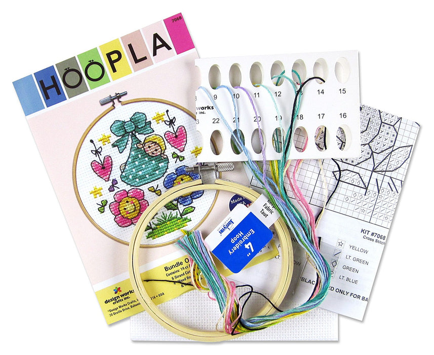 Beautiful designs and top quality materials make Design Works one of the top cross stitch kit makers worldwide. This package contains 14 count Aida, 100% cotton embroidery floss, one 4-inch embroidery hoop, one needle and fully illustrated chart and instructions. Finished Size: 4 inch round. Design: Baby. Made in USA.