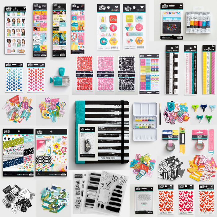 In STOCK. Ready to ship. Limited quantities of this super value Bible Journaling Doodles bundle deal kit. A curated Bible Journaling Craft Kit with top selling Illustrated Faith products. Mega Bundle Deal - Include 49 Illustrated Faith Products.